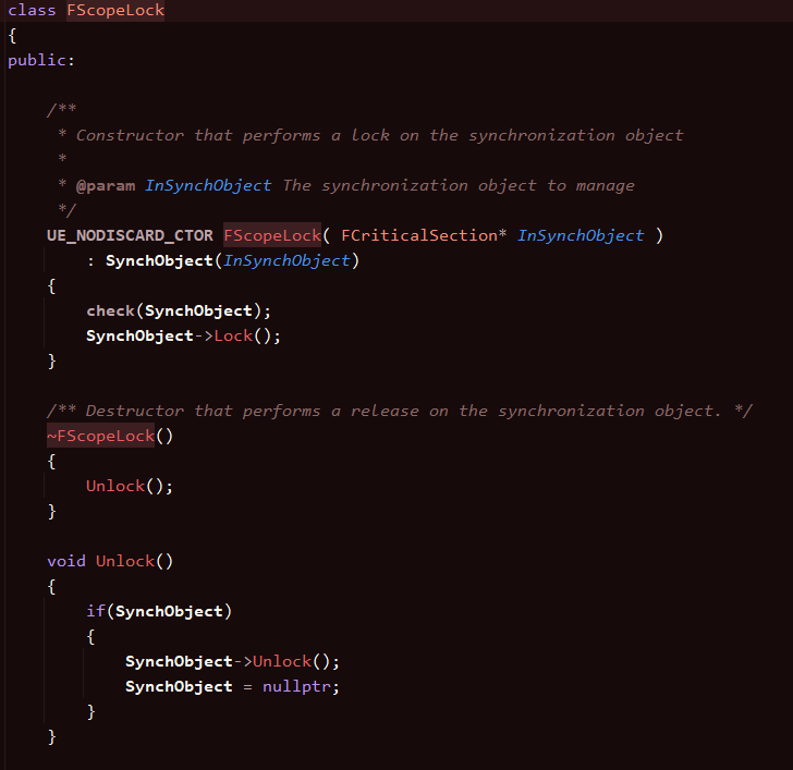 在Windows上是通过临界区实现的,而在其他平台是通过pthread提供的mutex实现的。临界区本身细节这里不细说,本质是操作系统提供的一对API(EnterCriticalSection/LeaveCriticalSection),保证这对API之间的代码同一时刻只有一个线程能访问。另外临界区本身不是系统的内核对象,从性能上对比,比系统的内核对象mutex要好很多。当然也有封装系统内核对象级别的互斥锁,UE封装成了FSystemWideCriticalSection。这里比较重要的一点是,UE提供的锁是同一线程可重入的,也就是说,递归加同一个锁是不会出现死锁的,会在最外层的锁释放时,锁才会真正释放。