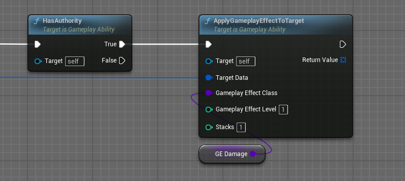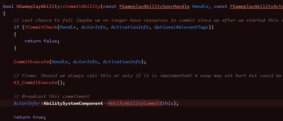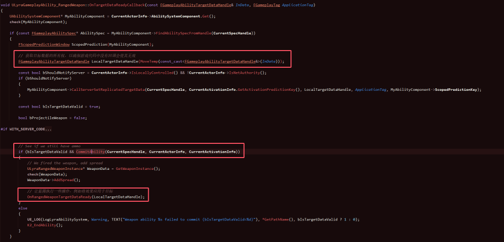 重点在这个函数中先主要通知了服务端(不知道干了些什么),再CommitAbility提交能力消耗,提交成功的话用之前处理好的数据给蓝图中应用伤害,比如应用配置的GE。